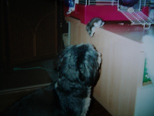 落ちそうなジロちゃんを それでも ジーっと見ているモエたん。